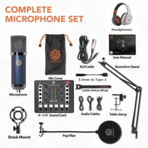 - Great Podcast Equipment Bundle: The Podcast Equipment Bundle is equipped with a 16cm Diaphram Microphone, Mic adjustable suspension scissor arm stand, Shock Mount, Pop Filter, and live sound card. This recording studio package was designed for singing, podcasting, streaming and recording music and short videos. What you get is a complete set of podcast microphone bundles.